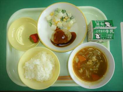 給食週間の最終日は、「ちいさなおばけシリーズ」にちなんだ献立です。ごはん、牛乳、おばけのアッチ豆腐ハンバーグ、サイコロサラダ、のらねこスープ、いちごです。
