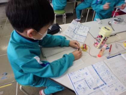 釘、鉄の缶、アルミ缶、紙など、それぞれが自分の電気を通す物発見機を使って調べ、記録していきました。