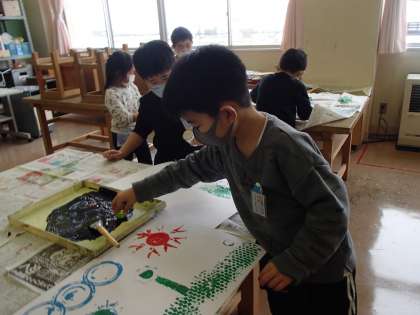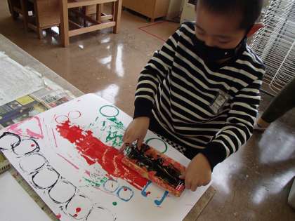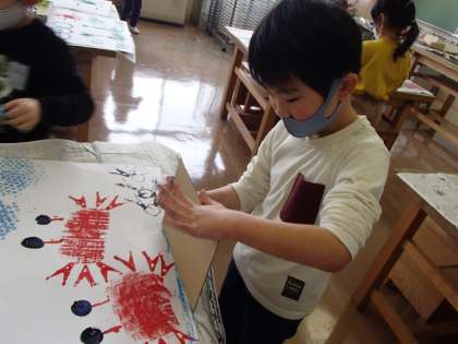 図工では、「うつした かたちから」の学習をしています。、今日は、おうちから持ってきた材料(ビニルの緩衝材、プリンカップやダンボールなど)で、水性インクを使っていろいろな形を写してみました。写していくうちに、「海の中みたい。海藻もつくろう」「にじができた」など、イメージがどんどんふくらんでいきました。みんな「すっごい、楽し〜い!」と言いながら、作品をつくっていました。