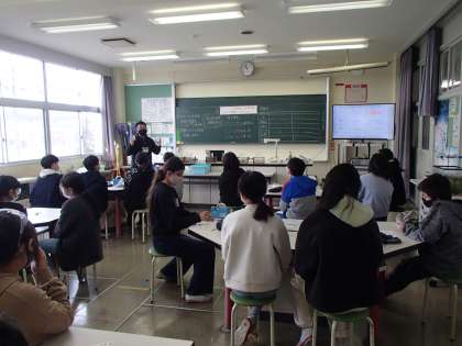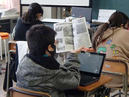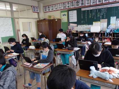 子供たちは、2学期に比べ意欲的に学習に取り組んでいます。理科では、水溶液の性質をリトマス紙を使って調べる活動に熱心に取り組んでいました。また、社会科では、戦争での日本各地の被害などの調べ学習をしました。子供たちは、富山市の空襲や沖縄戦、東京大空襲、原爆等、自分で特に調べたいものを決め、一人一台端末を使ってまとめました。一人一台端末のよいところは、図形や矢印を使って分かりやすくしたり、書き足りなかったら後で加えたり、自分の使った資料をコピーしてのせたりできるところです。「沖縄戦でのアメリカ軍と日本軍の数が全然違う」「日本より中国の方が被害がひどかったんだ」「富山市の空襲も思ったよりすごい」「東京大空襲は、106回もあったんだ」など、自分の調べたいことを真剣に調べまとめていました。自分の知りたいことを調べているので、子供たちは集中して取り組んでいました。月曜日に、全体で共有する予定です。