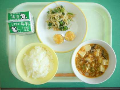 今日の給食は、ごはん、牛乳、マーボー豆腐、にんじんシューマイ、おひたしです。