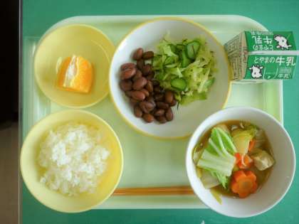 今日の給食は、ごはん、牛乳、ちゃんこ鍋、煮豆、きざみ和え、いよかんです。