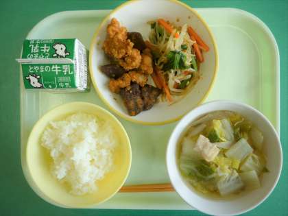 今日の給食は、ごはん、牛乳、鶏肉とレバーのカレー風味、小松菜のナムル、たら汁です。