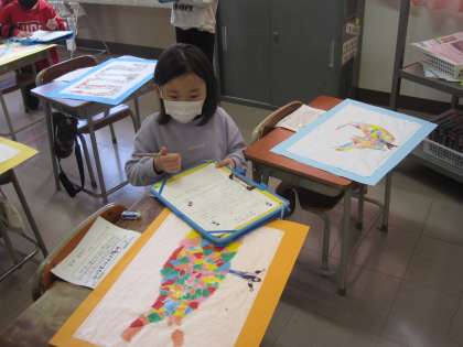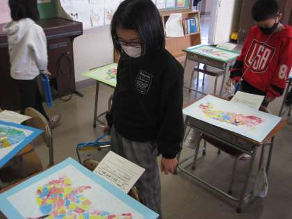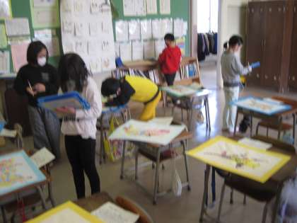 今日は図工の時間に2年生教室から2年生美術館にワープして鑑賞会を行いました。ソーシャルディスタンスに気をつけながら友達のよいところや、くふうしたところをみつけました。