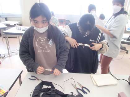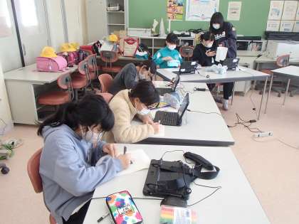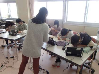 コンピュータ・科学クラブでは、この1年間でさまざまな実験を行ったりコンピュータで様々なものを作製したりしてきました。今日は何か形に残るものをつくろうと、プラバンでキーホルダーづくりをしました。コンピュータで自分が気に入ったキャラクターやロゴを印刷し、写し描いてつくりました。時折、友達と声をかけ合いながら、全員が集中して活動に取り組んでいました。