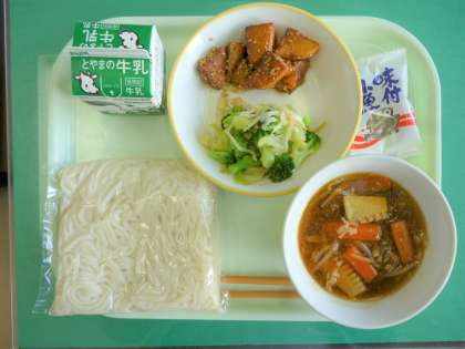 今日の給食は、ソフト麺、牛乳、五目あん、ごまだれポテト、切り干し大根のドレッシング和え、味付け小魚です。ごまだれポテトは新メニューです。