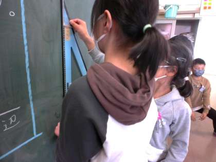 教師用の三角定規の角の大きさと、自分の三角定規の角の大きさを比べました。