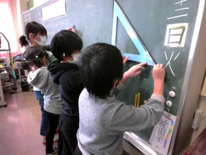 予想すると、「先生の三角定規の角の方が大きい」と考えた子が多くいました。実際に教師用の三角定規と比べたところ、「え〜同じだ!」と驚いていました。実際に確かめること大切ですね。