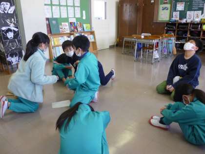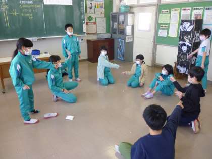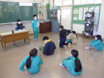 今日の元気タイムにクイズ・カードゲーム係主催の「人狼ゲーム集会」を行いました。みんなで話合いながら集会を楽しんでいました。
