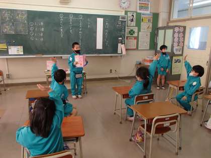 国語では、「これは、なんでしょう」の発表会をしました。どのヒントから出すのがよいのか、順番を考えて問題を出し合いました。