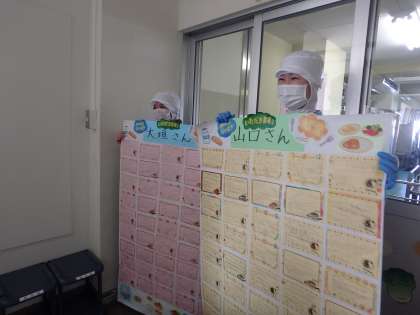 昨日、調理員の山口さんと大垣さんに、全校で書いた手紙をお渡ししました。「全部読みましたよ!」と喜んでくださった調理員さん。