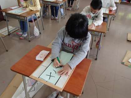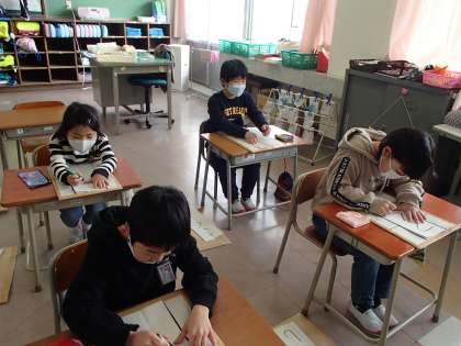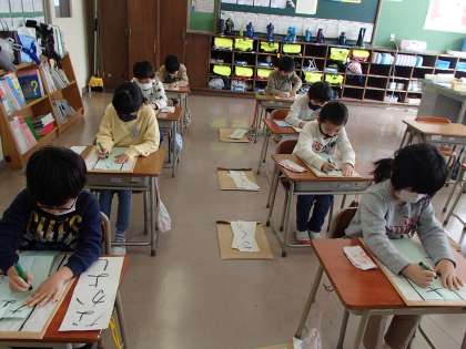 今日の国語は、硬筆墨を使いました。書き初め以来、久しぶりに使いましたが、みんなとても上手に書いていました。字のかたちや筆圧に気を付けて、書きました。