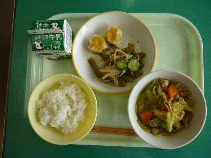 今日の給食は、ごはん、牛乳、回鍋肉、にんじんシューマイ、茎わかめのごま酢和えです。