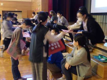 集会の最後には、卒業生から在校生へのすてきなプレゼントをもらいました。大切に使ってほしいと思います。