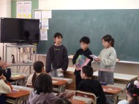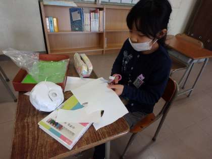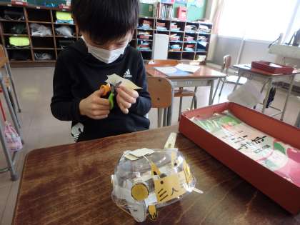 図工では、ねじったゴムが戻る力を使って動く仕組みをつくりました。