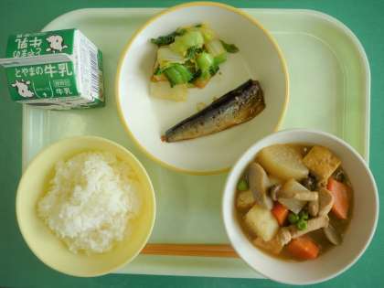 今日の給食は、ごはん、牛乳、いわしの生姜味、おひたし、鶏肉と根菜のごま煮です。