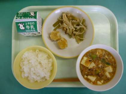 今日の給食は、ごはん、麻婆豆腐、にんじんシューマイ、茎わかめのチョナムル、牛乳です。