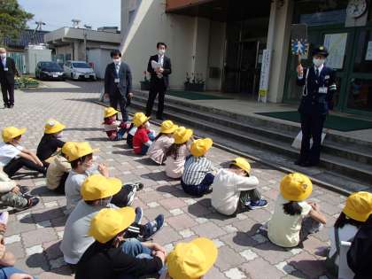 11日(月)に交通安全教室を行いました。警察の方と「足をそろえてしっかり止まる」「車が来ないか目でしっかり確かめる、右左右を見る」「耳で車が来ないか音を聞く」という3つの約束をしました。