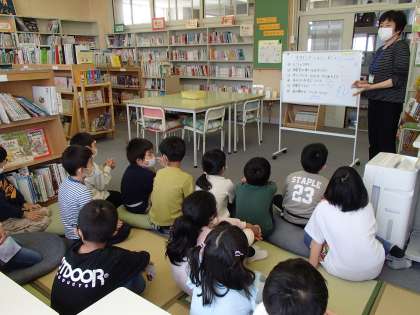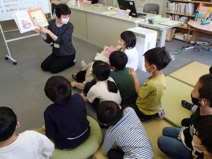 図書室利用のルールを確認した後は、「コッケモーモー」という絵本を読み聞かせしていただきました。とても楽しいお話で、子供たちは身を乗り出して夢中になって聞いていました。