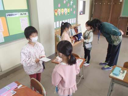 今日の国語の時間には、自分の名前を書いたカードを友達と交換しました。今日で、教室の全てのお友達とカードを交換し、自己紹介をしました。これからもっともっと仲を深めていってほしいと思います。