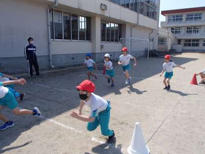 体育では、しっぽとりゲームを通して、リレーのリードの練習をしました。