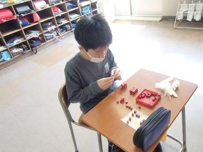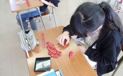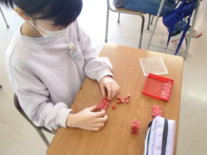 算数科の学習では、体積について学習をしています。ブロックを使って色々な24㎤の立体をつくりました。