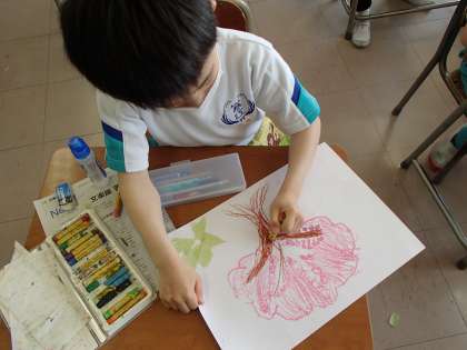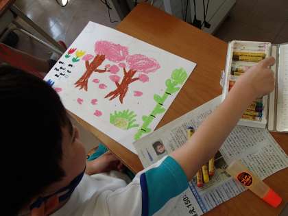 校庭のきれいな桜を見て、絵を描きました。子供たちが描くピンクに色づいた桜の木や、はらはらと花びらが散る様子がとても素敵でした。春のイメージに合わせて、国語で学習している「ふきのとう」を描く子供たちもいました。