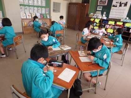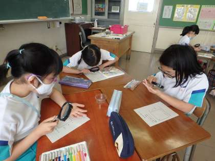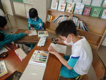 今日は、ホウセンカやひまわり等身近な植物の種を虫眼鏡を使って詳しく観察しました。種の大きさを測ったり、触ったりして種の特徴を詳しくまとめることができました。
