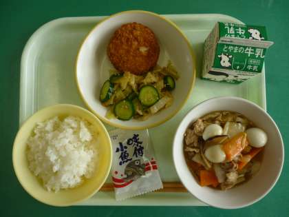 今日の給食は、ごはん、牛乳、えびカツ、キャベツのかふう和え、八宝菜、味付け小魚です。