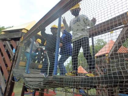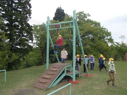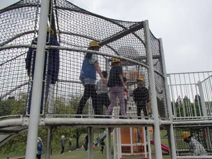 お弁当を食べた後は、班でおにごっこをしたり、遊具で遊んだりしました。たっぷり遊んで汗びっしょりになっている子供たちもいました。班の友達と仲よしになれました。