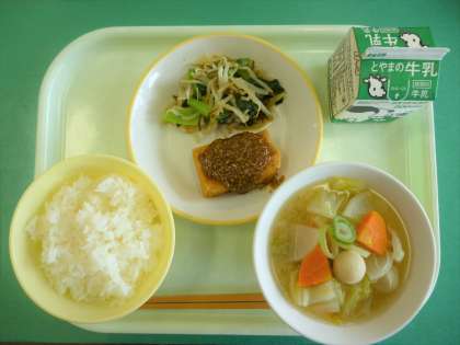 今日の給食は、ごはん、牛乳、揚げ出し豆腐のごまだれがけ、昆布和え、つみれ汁です。