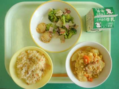 今日の給食は、五目ごはん、牛乳、ほたての香味焼き、ブロッコリーとエリンギのソテー、油麩の卵とじです。