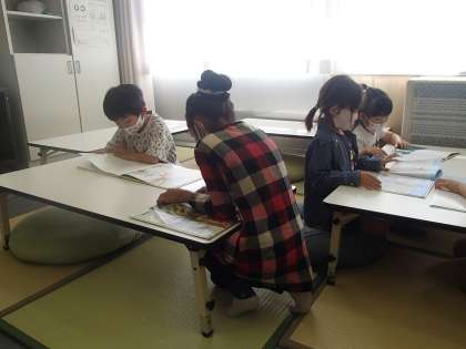 今日は国語科「としょかんへ いこう」の学習で、図書室に行き、いろいろな本をじっくり読みました。図書室にはくつろぎながら読めるスペースがあるので、みんなで静かに楽しく本に親しみました。