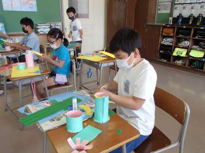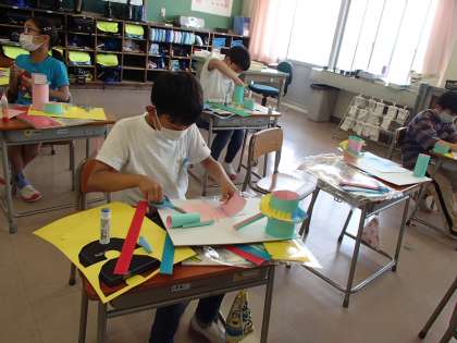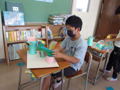 図工では、「コロコロガーレ」の制作に取り組んでいます。アイデアに詰まったときは、友達の作品を見せてもらったり、接着の方法を変えてみたりしながら、楽しそうにつくっています。