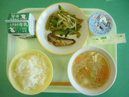 今日の給食は、ごはん、牛乳、いわしの生姜味、茎わかめサラダ、白玉汁、ヨーグルトです。
