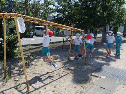 今週の体育では、遊具を使った運動をしています。