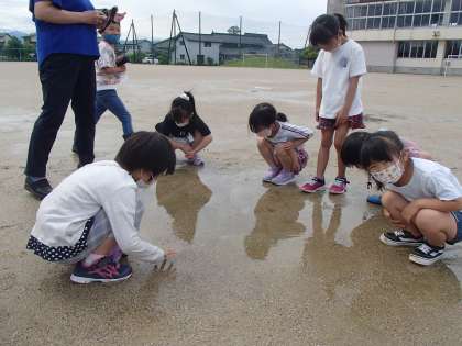 今日の生活科の時間では雨で様子の変わったグラウンド等を見に行きました。朝降っていた雨も上がり、観察するにはちょうどよい気候でした。水たまりに映る雲や電柱、校舎に気付き、みんなでじっくりと眺めていました。