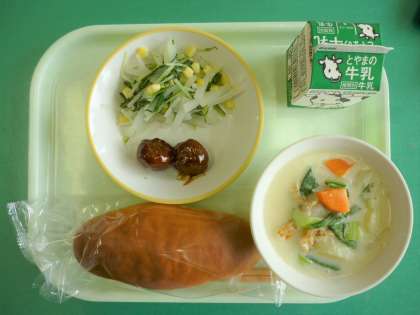 今日の給食は、コッペパン、牛乳、ミートボール、水菜のサラダ、ほたてのクリーム煮です。