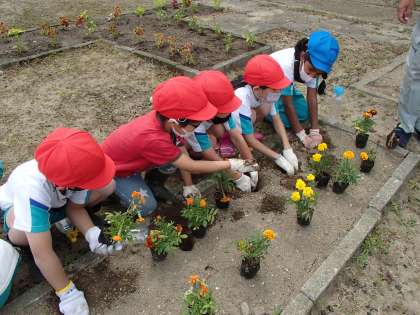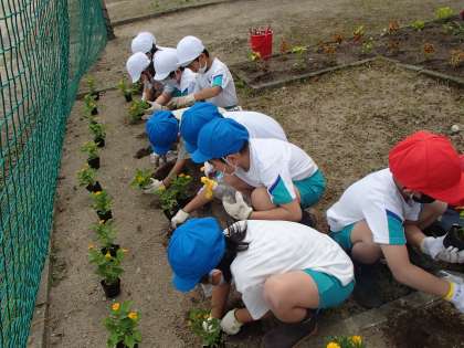 「マリーゴールド」は虫除けの効果があるので、2年生の畑にも分けてもらいました。みんなの大切な野菜を虫から守ってくれるといいですね。