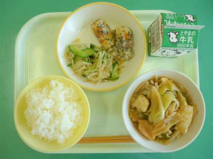 今日の給食は、ごはん、牛乳、ちくわの南部揚げ、甘酢和え、すき焼きです。