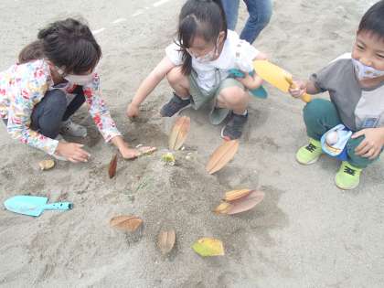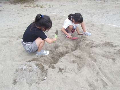 図画工作科の時間には、砂となかよしになりました。学校の砂場で思い付いた形やかざりを楽しみました。