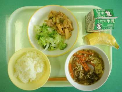 今日の給食は、ごはん、牛乳、あっさりチキン、添え野菜、卵ともずくのスープ、バナナです。