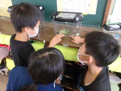 3年生教室では理科の学習と関連してモンシロチョウを育てています。最初は、学校のキャベツ畑から取ってきた小さな青虫が成虫となり、今日卵を産みました。一生懸命育てたモンシロチョウの成長を、子供たちはとてもよろこんでいます。