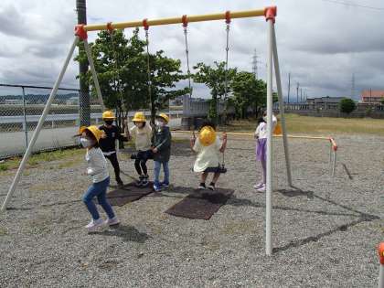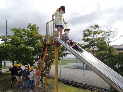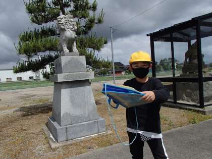 「二上神社」では、狛犬の表情の違いや神社の屋根の形、屋根に乗っている不思議な物等に関心をもち、思ったことを友達とたくさん話し合っていました。「中沖公園」では、すべり台やブランコ、鉄棒等の遊具で遊んだり、広場でおにごっこをしたりしました。