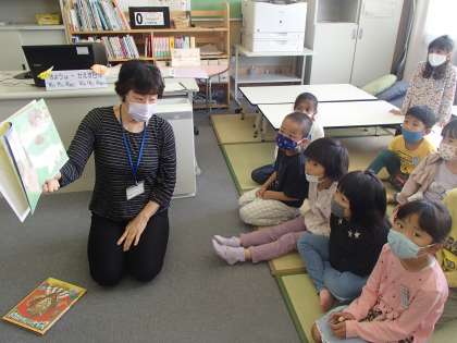 また図書室では、司書の先生に読み聞かせをしていただきました。子供たちは興味津々の様子でした。