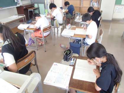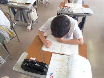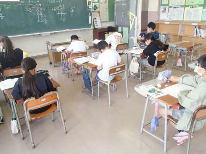 算数では、小数のわり算を学習しています。今までの学習をもとに小数点の位置に気を付け、正しく計算できるように練習しています。