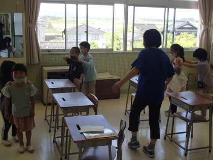 音楽の学習では、朝の会で歌っている「にじ」や、教科書にある「しろくまのジェンカ」等を楽しく歌いました。「しろくまのジェンカ」では、友達と一緒にリズムに合わせ、体を動かしながら音楽を楽しみました。