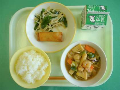 今日の給食は、ごはん、牛乳、春巻き、塩ナムル、八宝菜です。