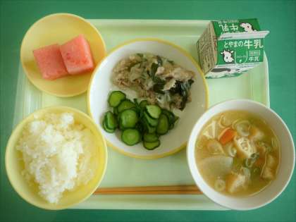 今日の給食は、ごはん、牛乳、豚肉の塩こうじ炒め、きゅうりもみ、みそ汁、すいかです。