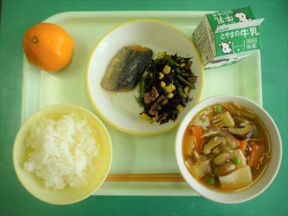 今日の給食は、ごはん、牛乳、鰆の西京焼き、ひじきのソテー、豆腐の野菜あんかけ、冷凍みかんです。